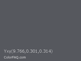 Yxy 9.766,0.301,0.314 Color is a normal blue color and the nearest color is Scarpa Flow #585562. Hex code #56585e and RGB value is rgb(86,88,94). In RGB color space, this color is composed of 34% red, 35% green, 37% blue, In CMYK color space, this color is composed of 9% cyan, 6% magenta, 0% yellow , 63% black , In HSL color space, this color has a hue angle of 225° , 4% saturation and 35% lightness.