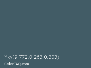 Yxy 9.772,0.263,0.303 Color is a normal blue color and the nearest color is Fiord #405169. Hex code #425c66 and RGB value is rgb(66,92,102). In RGB color space, this color is composed of 26% red, 36% green, 40% blue, In CMYK color space, this color is composed of 35% cyan, 10% magenta, 0% yellow , 60% black , In HSL color space, this color has a hue angle of 197° , 21% saturation and 33% lightness.
