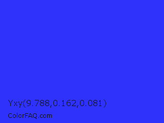 Yxy 9.788,0.162,0.081 Color is a normal blue color and the nearest color is Palatinate Blue #273be2. Hex code #2e32fa and RGB value is rgb(46,50,250). In RGB color space, this color is composed of 18% red, 20% green, 98% blue, In CMYK color space, this color is composed of 82% cyan, 80% magenta, 0% yellow , 2% black , In HSL color space, this color has a hue angle of 239° , 95% saturation and 58% lightness.