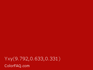 Yxy 9.792,0.633,0.331 Color is a normal red color and the nearest color is Mordant Red 19 #ae0c00. Hex code #b30906 and RGB value is rgb(179,9,6). In RGB color space, this color is composed of 70% red, 4% green, 2% blue, In CMYK color space, this color is composed of 0% cyan, 95% magenta, 97% yellow , 30% black , In HSL color space, this color has a hue angle of 1° , 94% saturation and 36% lightness.