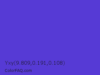 Yxy 9.809,0.191,0.108 Color is a normal indigo color and the nearest color is Iris #5a4fcf. Hex code #563ad5 and RGB value is rgb(86,58,213). In RGB color space, this color is composed of 34% red, 23% green, 84% blue, In CMYK color space, this color is composed of 60% cyan, 73% magenta, 0% yellow , 16% black , In HSL color space, this color has a hue angle of 251° , 65% saturation and 53% lightness.
