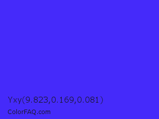 Yxy 9.823,0.169,0.081 Color is a normal indigo color and the nearest color is Han Purple #5218fa. Hex code #452afa and RGB value is rgb(69,42,250). In RGB color space, this color is composed of 27% red, 16% green, 98% blue, In CMYK color space, this color is composed of 72% cyan, 83% magenta, 0% yellow , 2% black , In HSL color space, this color has a hue angle of 248° , 95% saturation and 57% lightness.