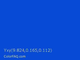 Yxy 9.824,0.165,0.112 Color is a normal blue color and the nearest color is Absolute Zero #0048ba. Hex code #064bd4 and RGB value is rgb(6,75,212). In RGB color space, this color is composed of 2% red, 29% green, 83% blue, In CMYK color space, this color is composed of 97% cyan, 65% magenta, 0% yellow , 17% black , In HSL color space, this color has a hue angle of 220° , 94% saturation and 43% lightness.