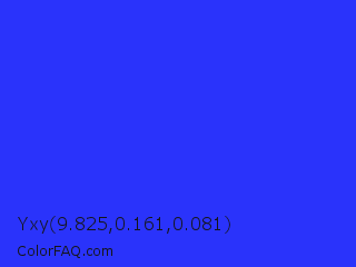Yxy 9.825,0.161,0.081 Color is a normal blue color and the nearest color is Palatinate Blue #273be2. Hex code #2a33fb and RGB value is rgb(42,51,251). In RGB color space, this color is composed of 16% red, 20% green, 98% blue, In CMYK color space, this color is composed of 83% cyan, 80% magenta, 0% yellow , 2% black , In HSL color space, this color has a hue angle of 237° , 96% saturation and 57% lightness.
