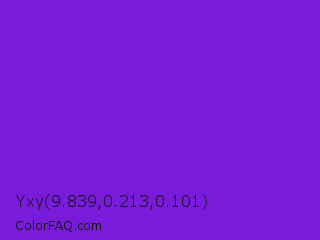 Yxy 9.839,0.213,0.101 Color is a normal violet color and the nearest color is Blue Violet #8a2be2. Hex code #781bda and RGB value is rgb(120,27,218). In RGB color space, this color is composed of 47% red, 11% green, 85% blue, In CMYK color space, this color is composed of 45% cyan, 88% magenta, 0% yellow , 15% black , In HSL color space, this color has a hue angle of 269° , 78% saturation and 48% lightness.