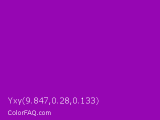 Yxy 9.847,0.28,0.133 Color is a normal purple color and the nearest color is Violet RYB #8601af. Hex code #9606b3 and RGB value is rgb(150,6,179). In RGB color space, this color is composed of 59% red, 2% green, 70% blue, In CMYK color space, this color is composed of 16% cyan, 97% magenta, 0% yellow , 30% black , In HSL color space, this color has a hue angle of 290° , 94% saturation and 36% lightness.