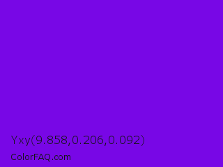 Yxy 9.858,0.206,0.092 Color is a normal violet color and the nearest color is Violet Color Wheel #7f00ff. Hex code #7807e6 and RGB value is rgb(120,7,230). In RGB color space, this color is composed of 47% red, 3% green, 90% blue, In CMYK color space, this color is composed of 48% cyan, 97% magenta, 0% yellow , 10% black , In HSL color space, this color has a hue angle of 270° , 94% saturation and 46% lightness.