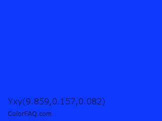Yxy 9.859,0.157,0.082 Color is a normal blue color and the nearest color is Blue RYB #0247fe. Hex code #0d38fa and RGB value is rgb(13,56,250). In RGB color space, this color is composed of 5% red, 22% green, 98% blue, In CMYK color space, this color is composed of 95% cyan, 78% magenta, 0% yellow , 2% black , In HSL color space, this color has a hue angle of 229° , 96% saturation and 52% lightness.