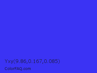 Yxy 9.86,0.167,0.085 Color is a normal indigo color and the nearest color is Palatinate Blue #273be2. Hex code #3b33f4 and RGB value is rgb(59,51,244). In RGB color space, this color is composed of 23% red, 20% green, 96% blue, In CMYK color space, this color is composed of 76% cyan, 79% magenta, 0% yellow , 4% black , In HSL color space, this color has a hue angle of 242° , 90% saturation and 58% lightness.