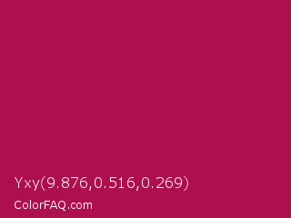Yxy 9.876,0.516,0.269 Color is a normal rose color and the nearest color is French Wine #ac1e44. Hex code #ae0f4d and RGB value is rgb(174,15,77). In RGB color space, this color is composed of 68% red, 6% green, 30% blue, In CMYK color space, this color is composed of 0% cyan, 91% magenta, 56% yellow , 32% black , In HSL color space, this color has a hue angle of 337° , 84% saturation and 37% lightness.