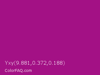 Yxy 9.881,0.372,0.188 Color is a normal magenta color and the nearest color is Violet Eggplant #991199. Hex code #a31185 and RGB value is rgb(163,17,133). In RGB color space, this color is composed of 64% red, 7% green, 52% blue, In CMYK color space, this color is composed of 0% cyan, 90% magenta, 18% yellow , 36% black , In HSL color space, this color has a hue angle of 312° , 81% saturation and 35% lightness.
