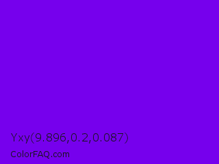 Yxy 9.896,0.2,0.087 Color is a normal violet color and the nearest color is Electric Indigo #6f00ff. Hex code #7600ed and RGB value is rgb(118,0,237). In RGB color space, this color is composed of 46% red, 0% green, 93% blue, In CMYK color space, this color is composed of 50% cyan, 100% magenta, 0% yellow , 7% black , In HSL color space, this color has a hue angle of 270° , 100% saturation and 46% lightness.