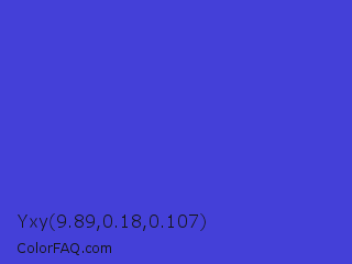 Yxy 9.89,0.18,0.107 Color is a normal indigo color and the nearest color is Iris #5a4fcf. Hex code #4440d8 and RGB value is rgb(68,64,216). In RGB color space, this color is composed of 27% red, 25% green, 85% blue, In CMYK color space, this color is composed of 69% cyan, 70% magenta, 0% yellow , 15% black , In HSL color space, this color has a hue angle of 242° , 66% saturation and 55% lightness.
