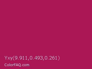 Yxy 9.911,0.493,0.261 Color is a normal rose color and the nearest color is Jazzberry Jam #a50b5e. Hex code #ab1754 and RGB value is rgb(171,23,84). In RGB color space, this color is composed of 67% red, 9% green, 33% blue, In CMYK color space, this color is composed of 0% cyan, 87% magenta, 51% yellow , 33% black , In HSL color space, this color has a hue angle of 335° , 76% saturation and 38% lightness.