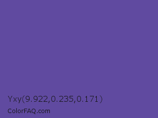 Yxy 9.922,0.235,0.171 Color is a normal indigo color and the nearest color is Butterfly Bush #624e9a. Hex code #604aa0 and RGB value is rgb(96,74,160). In RGB color space, this color is composed of 38% red, 29% green, 63% blue, In CMYK color space, this color is composed of 40% cyan, 54% magenta, 0% yellow , 37% black , In HSL color space, this color has a hue angle of 255° , 37% saturation and 46% lightness.