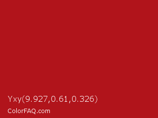 Yxy 9.927,0.61,0.326 Color is a normal red color and the nearest color is Carnelian #b31b1b. Hex code #b1141b and RGB value is rgb(177,20,27). In RGB color space, this color is composed of 69% red, 8% green, 11% blue, In CMYK color space, this color is composed of 0% cyan, 89% magenta, 85% yellow , 31% black , In HSL color space, this color has a hue angle of 357° , 80% saturation and 39% lightness.