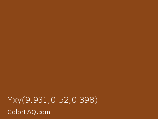 Yxy 9.931,0.52,0.398 Color is a normal orange color and the nearest color is Saddle Brown #8b4513. Hex code #8b4617 and RGB value is rgb(139,70,23). In RGB color space, this color is composed of 55% red, 27% green, 9% blue, In CMYK color space, this color is composed of 0% cyan, 50% magenta, 83% yellow , 45% black , In HSL color space, this color has a hue angle of 24° , 72% saturation and 32% lightness.