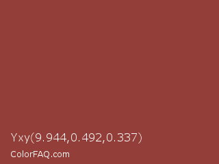 Yxy 9.944,0.492,0.337 Color is a normal red color and the nearest color is Sanguine Brown #8d3d38. Hex code #933e39 and RGB value is rgb(147,62,57). In RGB color space, this color is composed of 58% red, 24% green, 22% blue, In CMYK color space, this color is composed of 0% cyan, 58% magenta, 61% yellow , 42% black , In HSL color space, this color has a hue angle of 3° , 44% saturation and 40% lightness.
