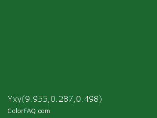 Yxy 9.955,0.287,0.498 Color is a dark green color and the nearest color is Green Pea #1d6142. Hex code #1c662f and RGB value is rgb(28,102,47). In RGB color space, this color is composed of 11% red, 40% green, 18% blue, In CMYK color space, this color is composed of 73% cyan, 0% magenta, 54% yellow , 60% black , In HSL color space, this color has a hue angle of 135° , 57% saturation and 25% lightness.