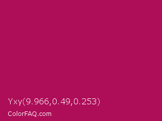 Yxy 9.966,0.49,0.253 Color is a normal rose color and the nearest color is Jazzberry Jam #a50b5e. Hex code #ae0d58 and RGB value is rgb(174,13,88). In RGB color space, this color is composed of 68% red, 5% green, 35% blue, In CMYK color space, this color is composed of 0% cyan, 93% magenta, 49% yellow , 32% black , In HSL color space, this color has a hue angle of 332° , 86% saturation and 37% lightness.