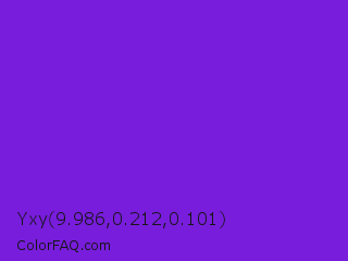 Yxy 9.986,0.212,0.101 Color is a normal violet color and the nearest color is Blue Violet #8a2be2. Hex code #781ddb and RGB value is rgb(120,29,219). In RGB color space, this color is composed of 47% red, 11% green, 86% blue, In CMYK color space, this color is composed of 45% cyan, 87% magenta, 0% yellow , 14% black , In HSL color space, this color has a hue angle of 269° , 77% saturation and 49% lightness.