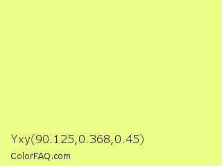 Yxy 90.125,0.368,0.45 Color is a light yellow color and the nearest color is Honeysuckle #edfc84. Hex code #eafe87 and RGB value is rgb(234,254,135). In RGB color space, this color is composed of 92% red, 100% green, 53% blue, In CMYK color space, this color is composed of 8% cyan, 0% magenta, 47% yellow , 0% black , In HSL color space, this color has a hue angle of 70° , 98% saturation and 76% lightness.