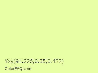 Yxy 91.226,0.35,0.422 Color is a very light lime color and the nearest color is Tidal #f1ffad. Hex code #e8ffa5 and RGB value is rgb(232,255,165). In RGB color space, this color is composed of 91% red, 100% green, 65% blue, In CMYK color space, this color is composed of 9% cyan, 0% magenta, 35% yellow , 0% black , In HSL color space, this color has a hue angle of 75° , 100% saturation and 82% lightness.