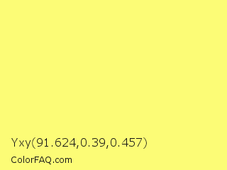 Yxy 91.624,0.39,0.457 Color is a light yellow color and the nearest color is Paris Daisy #fff46e. Hex code #fcfc76 and RGB value is rgb(252,252,118). In RGB color space, this color is composed of 99% red, 99% green, 46% blue, In CMYK color space, this color is composed of 0% cyan, 0% magenta, 53% yellow , 1% black , In HSL color space, this color has a hue angle of 60° , 96% saturation and 73% lightness.