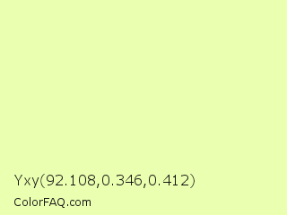 Yxy 92.108,0.346,0.412 Color is a very light lime color and the nearest color is Tidal #f1ffad. Hex code #eaffaf and RGB value is rgb(234,255,175). In RGB color space, this color is composed of 92% red, 100% green, 69% blue, In CMYK color space, this color is composed of 8% cyan, 0% magenta, 31% yellow , 0% black , In HSL color space, this color has a hue angle of 76° , 100% saturation and 84% lightness.