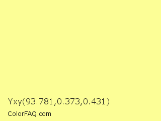 Yxy 93.781,0.373,0.431 Color is a light yellow color and the nearest color is Pastel Yellow #fdfd96. Hex code #fcfe96 and RGB value is rgb(252,254,150). In RGB color space, this color is composed of 99% red, 100% green, 59% blue, In CMYK color space, this color is composed of 1% cyan, 0% magenta, 41% yellow , 0% black , In HSL color space, this color has a hue angle of 61° , 98% saturation and 79% lightness.
