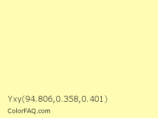 Yxy 94.806,0.358,0.401 Color is a very light yellow color and the nearest color is Portafino #ffffb4. Hex code #fffdb4 and RGB value is rgb(255,253,180). In RGB color space, this color is composed of 100% red, 99% green, 71% blue, In CMYK color space, this color is composed of 0% cyan, 1% magenta, 29% yellow , 0% black , In HSL color space, this color has a hue angle of 58° , 100% saturation and 85% lightness.